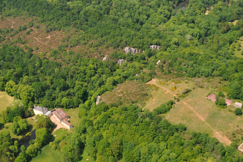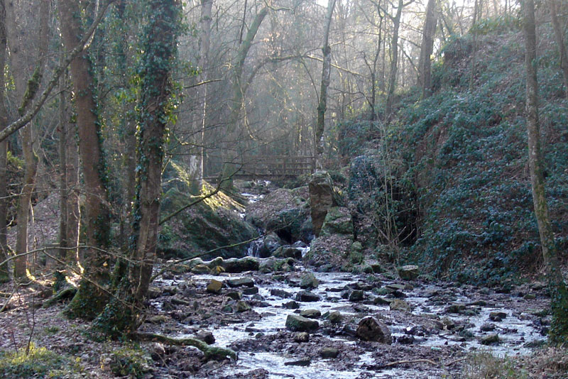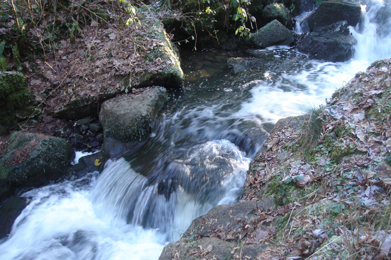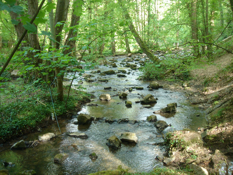 Après la traversée du Grès armoricain du paléorelief, le Laizon suit la base de la pente rocheuse sur quelques dizaines de mètres : il s’élargit et perd son caractère torrentiel. |