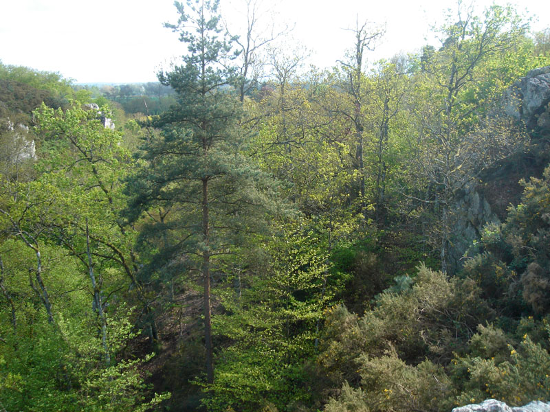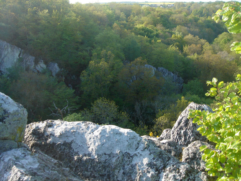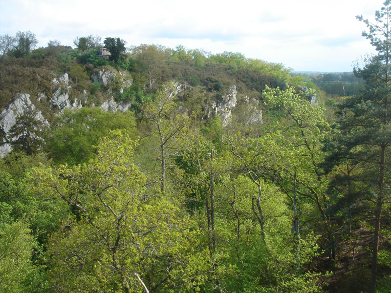 Sous le tombeau de tombeau de Marie Joly, la paroi est abrupte et le Grès armoricain apparaît coupé net par la cluse du Laizon. |