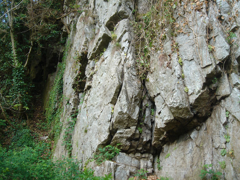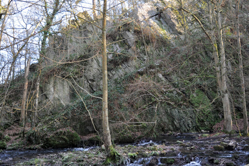 Haute paroi presque verticale à l’entrée de la cluse en rive droite, utilisée comme site d’escalade. Le creusement dans le paléorelief de Grès armoricain par le Laizon atteint une bonne trentaine de mètres. |