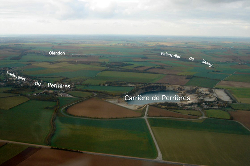 La carrière de Perrières est le dernier affleurement de Grès armoricain du synclinal d’Urville vers l’Est. Les paléoreliefs de Grès armoricain de Sassy, au Nord, et d’Olendon et Perrières, au Sud, présentent une auréole de calcaires bathoniens du Faciès de bordure des écueils.