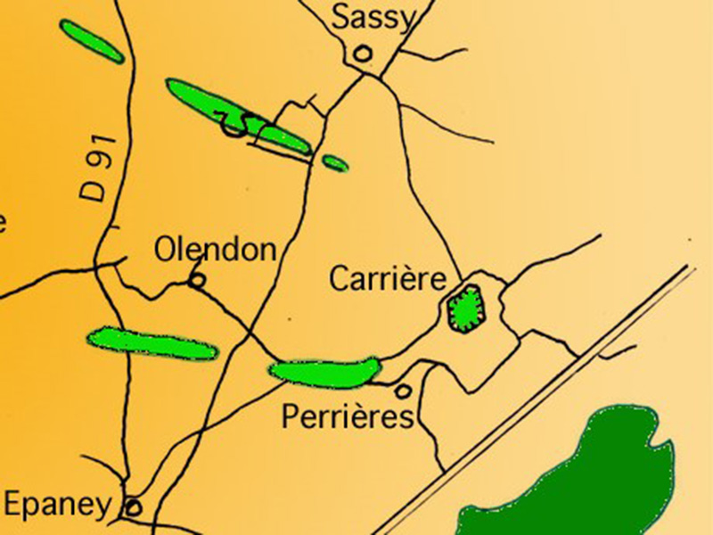 Le paléorelief de Perrières est proche du paléorelief de Sassy situé au Nord-Ouest, dans le flanc nord du synclinal paléozoïque d’Urville. Vue prise vers le Nord, année 2010