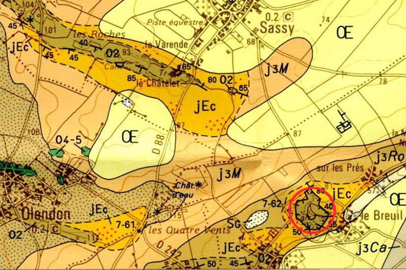 La carrière de Perrières a été creusée dans le Grès armoricain de l’extrémité Est du synclinal d’Urville dont les flancs sont jalonnés par le paléorelief de Perrières au Sud et par le paléorelief de Sassy, au Nord. |