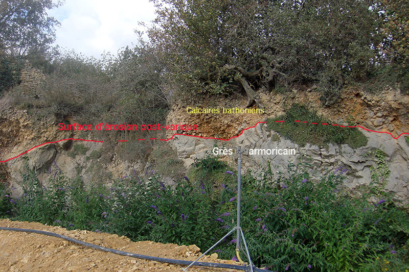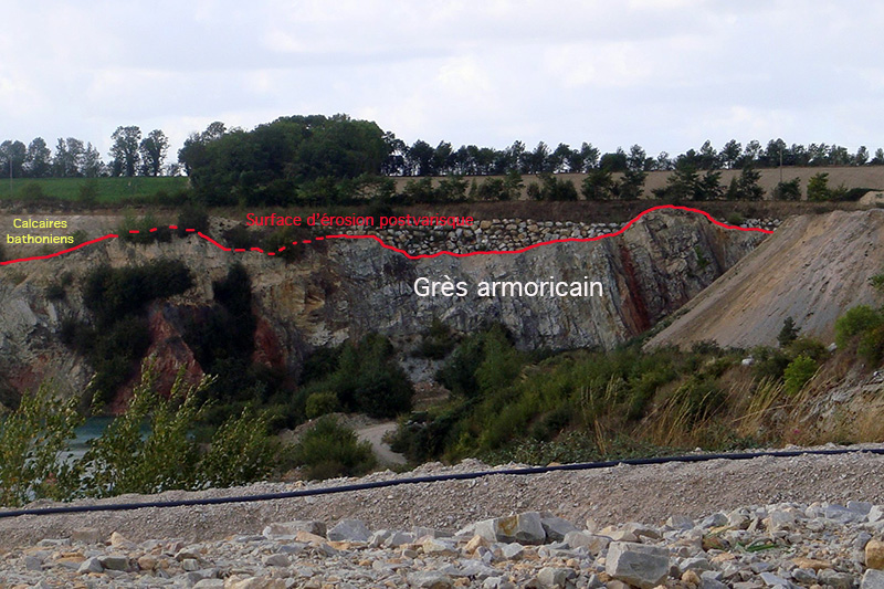 Les fronts de taille de la carrière exposent la discordance varisque : les calcaires jurassiques (Faciès de bordure des écueils - Bathonien) du Bassin parisien reposent sur les grès ordoviciens (Grès armoricain) plissés du socle armoricain. |
