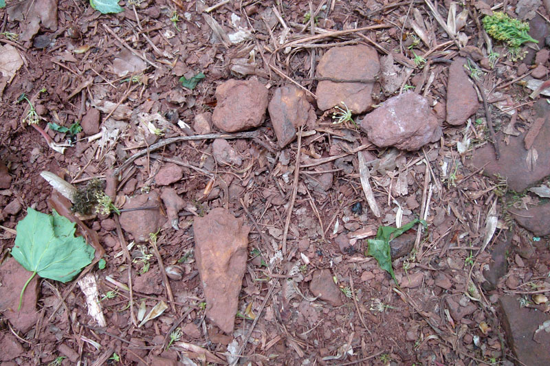 Des débris de minerai de fer donnent une coloration rouge à un affouillement de la base du talus et au chemin qui monte à flanc de coteau vers le paléorelief de Grès armoricain.