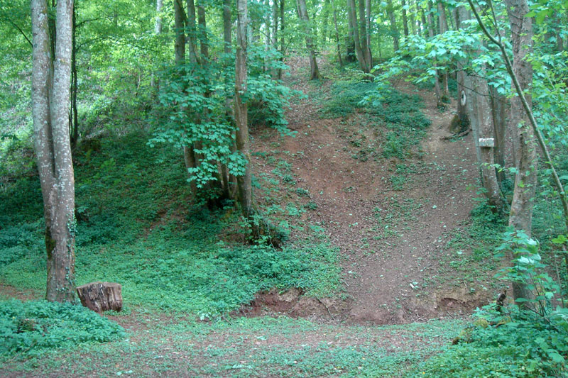 L’extraction ancienne du minerai a laissé des excavations éparses au sommet du coteau. |
