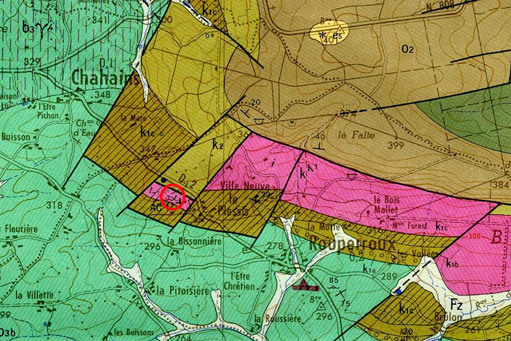 | Les ignimbrites de la carrière de Rouperroux appartiennent aux terrains cambriens du flanc nord de l’anticlinal de Saint-Didier-sous-Ecouves. |