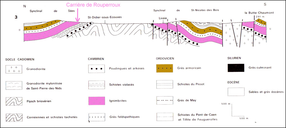 Coupe transversale de la bordure ouest du Massif d’Ecouves Extrait de la notice explicative de la carte géologique à 1/50 000 de la Ferté-Macé La carrière de Rouperroux est creusée dans les ignimbrites du flanc nord de l’anticlinal de Saint-Didier-sous-Ecouves. Ce dernier correspond au flanc sud du synclinal de Sées. |