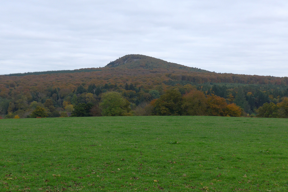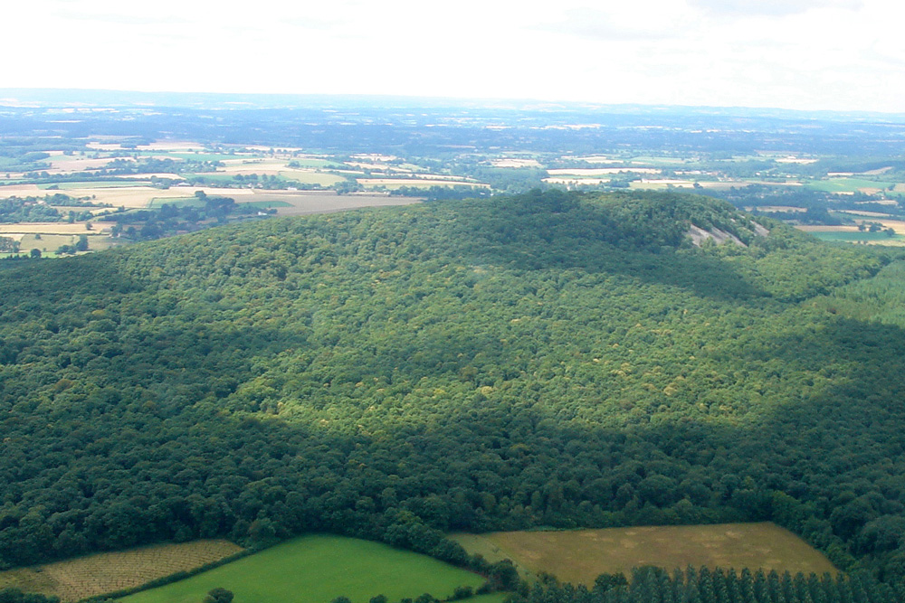 A l’Ouest, la Butte-Chaumont domine le socle armoricain couvert de prairies. La crête présente un profil dissymétrique avec un escarpement abrupt sur la face nord. |