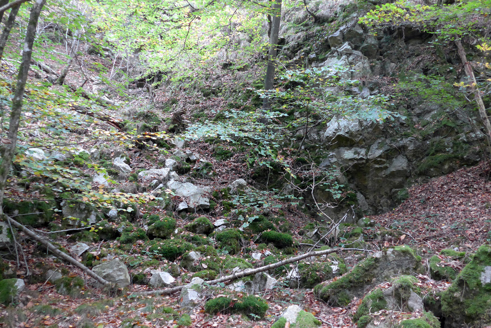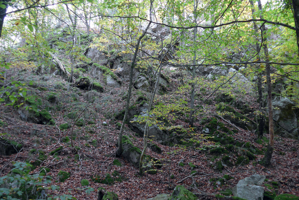 Affleurement de Grès armoricain dans le versant ouest de la Butte-Chaumont dominé par un escarpement rocheux, masqué par les arbres. |