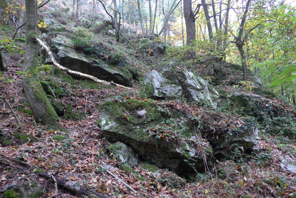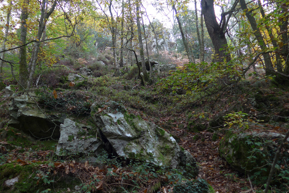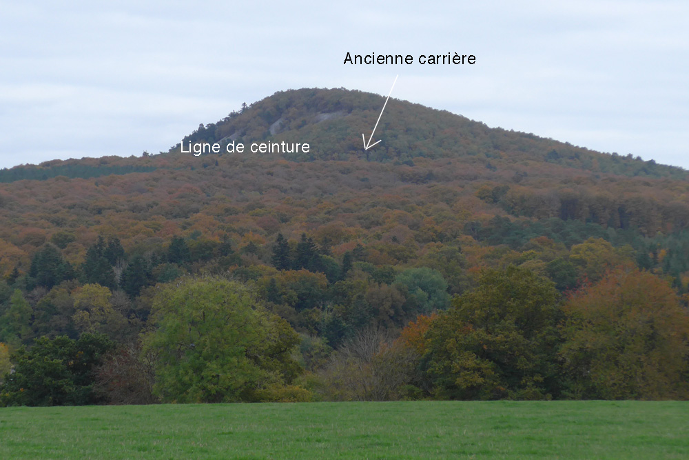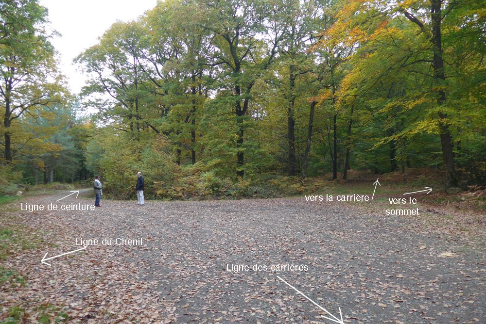 Point coté 291m au Carrefour de la Ligne des Carrières, de la Ligne du Chenil (à gauche, non visible), de la Ligne de Ceinture (en face à gauche sur la photo) et du chemin menant au sommet de la Butte (vers la droite). Le sentier d’accès à l’ancienne carrière part du carrefour, en face à droite, il suit la Ligne de ceinture sur environ 100m jusqu’à l’ancienne carrière ; il monte ensuite vers les pierriers. On accède à ce carrefour à pied à partir de la D250 (au SO) ou à partir de l’ermitage de la Cassine (au NO)