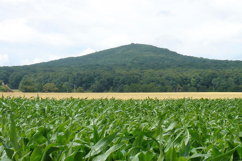 Le Grès armoricain de la Butte-Chaumont (377 m) domine les terrains jurassiques de la plaine d’Alençon couverte de champs de céréales (160 m).