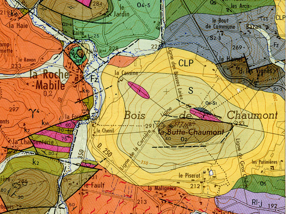 Le Grès armoricain de la Butte Chaumont appartient à un panneau de terrains paléozoïques surélevé par des failles réactivées au Cénozoïque et isolé entre le synclinal de Saint-Nicolas-des-Bois (O3-4, O4-5, S2-3, d1) au Nord et le socle granitique ( ) au Sud. Les contacts sont masqués par les dépôts quaternaires (CLP et S). |