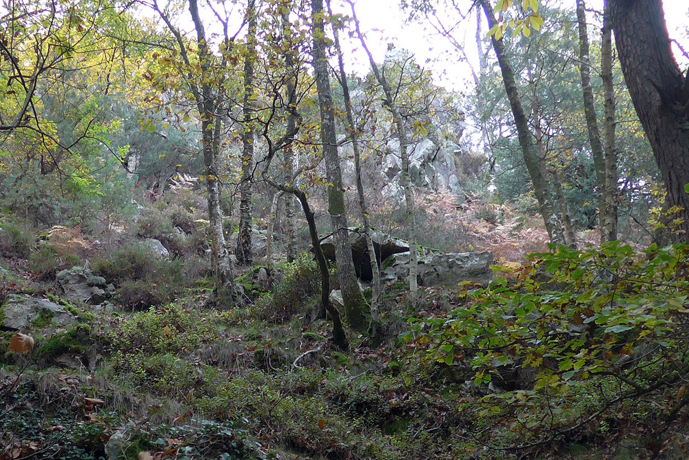 Le Grès armoricain se présente en bancs massifs plus ou moins disloqués et envahis par la végétation. On peut observer des faces inférieures de bancs, en léger surplomb. |