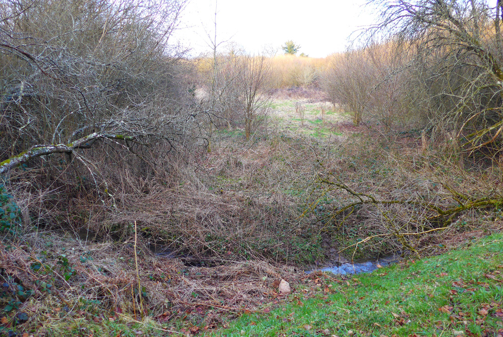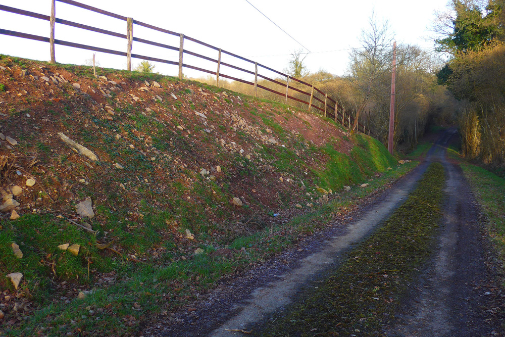 Les ignimbrites étaient autrefois exploitées dans une petite carrière située à l’Est des Gaudinières, au Nord de l’étang. Elle est aujourd’hui entièrement comblée et envahie par la végétation. |