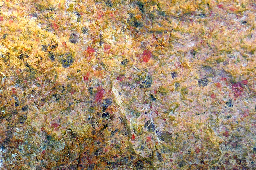 De nombreux phénocristaux de quartz gris vitreux et de feldspaths potassiques roses sont enrobés dans une pâte gris clair. L’analyse chimique indique que cette ignimbrite très acide (69% de silice) a la composition d’une rhyolite.