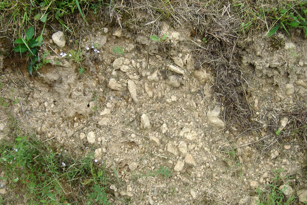 Le fossé est creusé dans des ignimbrites altérées ; des blocs d’ignimbrite se mêlent aux produits de l’altération.
