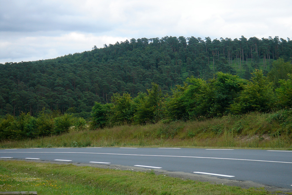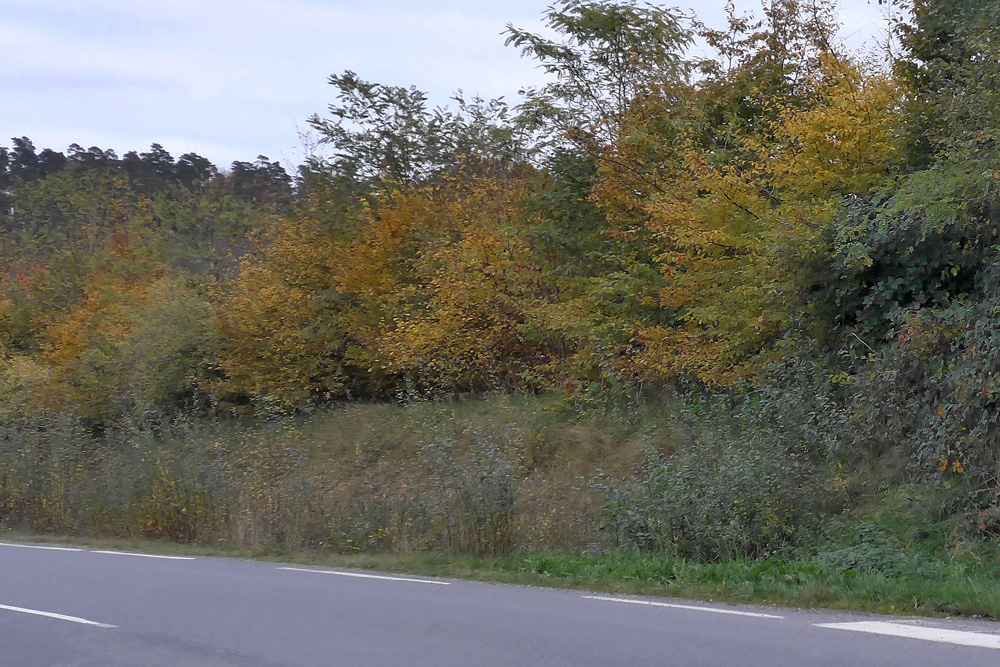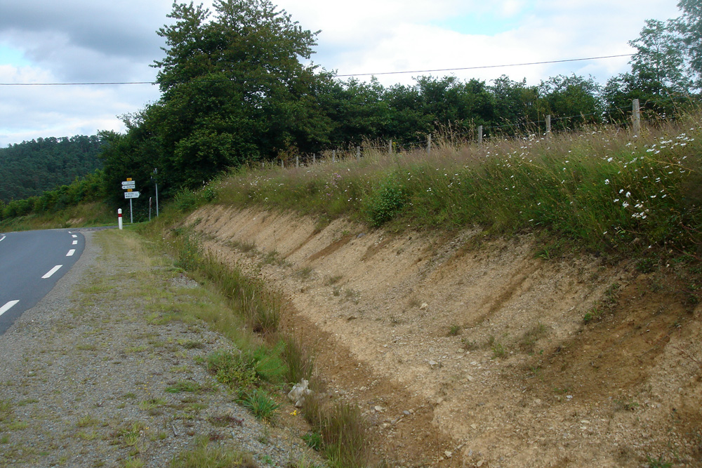Le talus routier borde le large virage de la route D2, au point coté 295. Des galets jalonnent la base de ce talus.