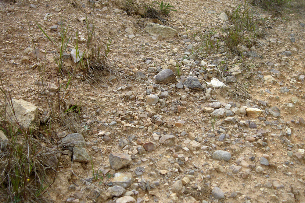 Accumulation de galets et de blocs peu usés à la base du talus ; ces galets, issus du niveau conglomératique, sont de nature variée : grès briovériens (41%), grès feldspathiques cambriens (23,5%) et des roches volcaniques cambriennes (33,5%). Ils témoignent d’un épisode d’érosion intense contemporain de l’activité volcanique régionale.