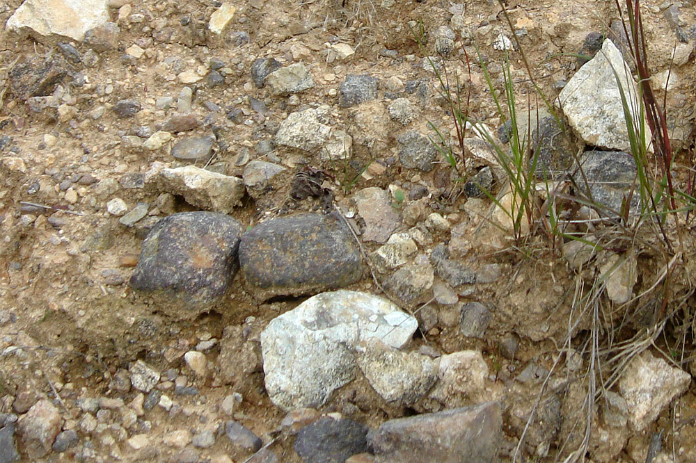 Un niveau conglomératique constitue la partie basse du talus de la route D2 qui mène d’Alençon à Carrouges, de part et d’autre du carrefour avec la route D536 menant de la Roche-Mabile à Livaie.