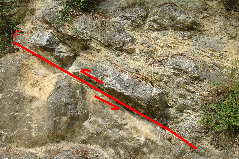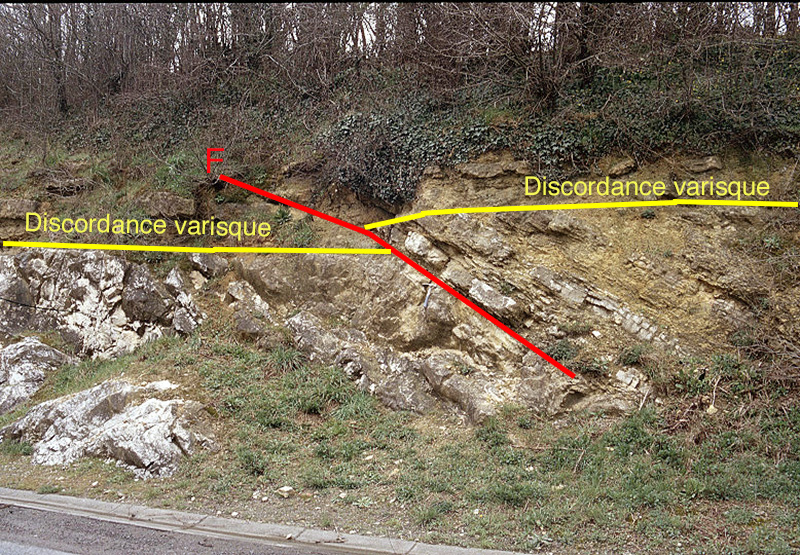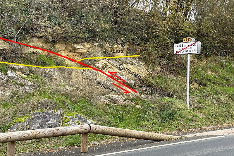 Le décalage vertical de la surface de discordance de part et d’autre de la faille permet de visualiser le rejet de la faille, de l’ordre de 0,50 mètres.