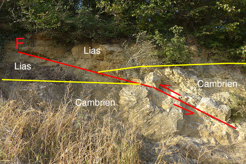 Les siltites et calcaires cambriens du compartiment nord de la faille (à droite) remontent sur les calcaires du Lias qui reposent sur les calcaires massifs cambriens du compartiment sud (à gauche). Le mouvement relatif des deux compartiments aboutit à un raccourcissement. La faille est compressive.