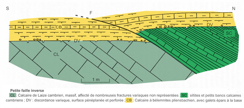 Une faille inverse affecte les calcaires cambriens (Paléozoïque) ainsi que les calcaires du Lias (Mésozoïque) qui les surmontent en discordance. C’est une faille satellite d’une faille principale, la faille de Vieux située 50 m plus au Nord, et qui présente un rejet vertical de 20 mètres. Ces failles inverses témoignent d'une contrainte compressive en relation avec le début de l'orogenèse alpine, lors de la collision de l'Afrique avec l'Europe.