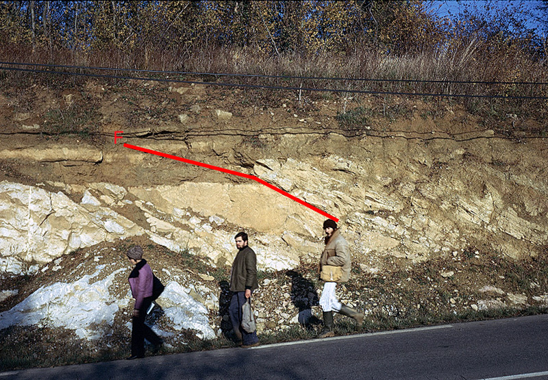 Peu après des travaux d’élargissement de la route D562, l’affleurement, alors dépourvu de végétation, exposait clairement la faille inverse...