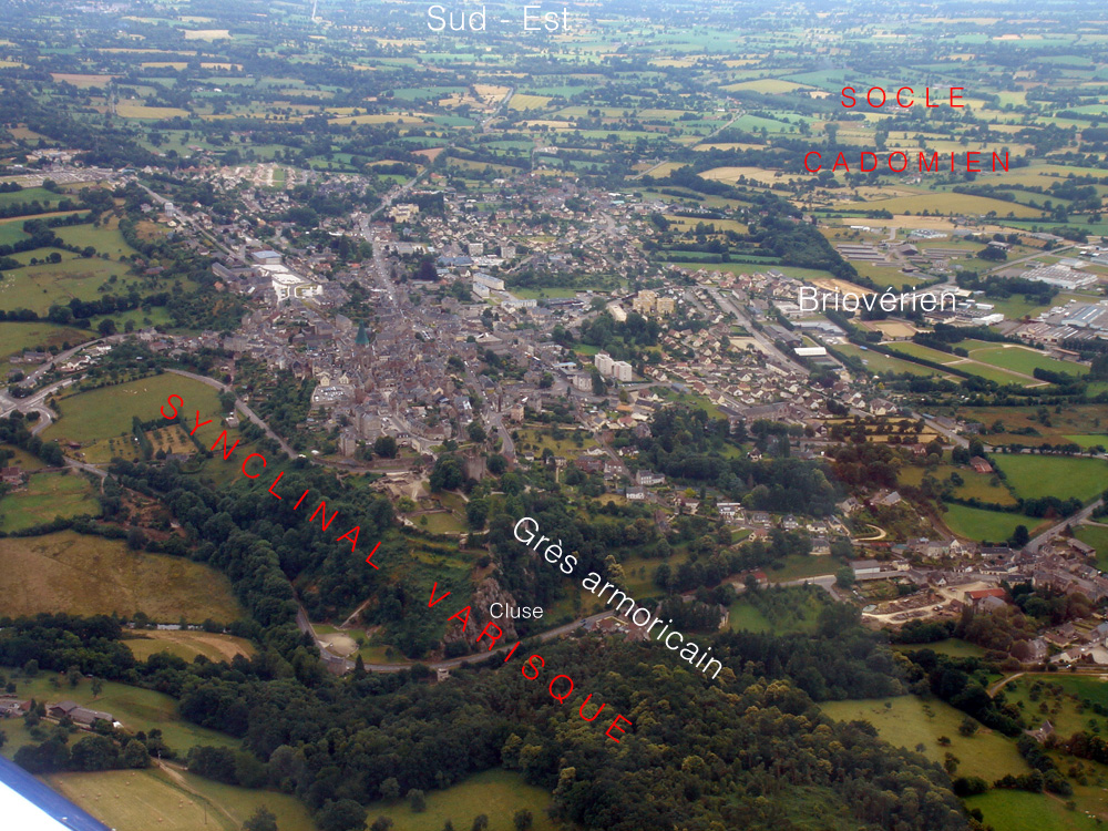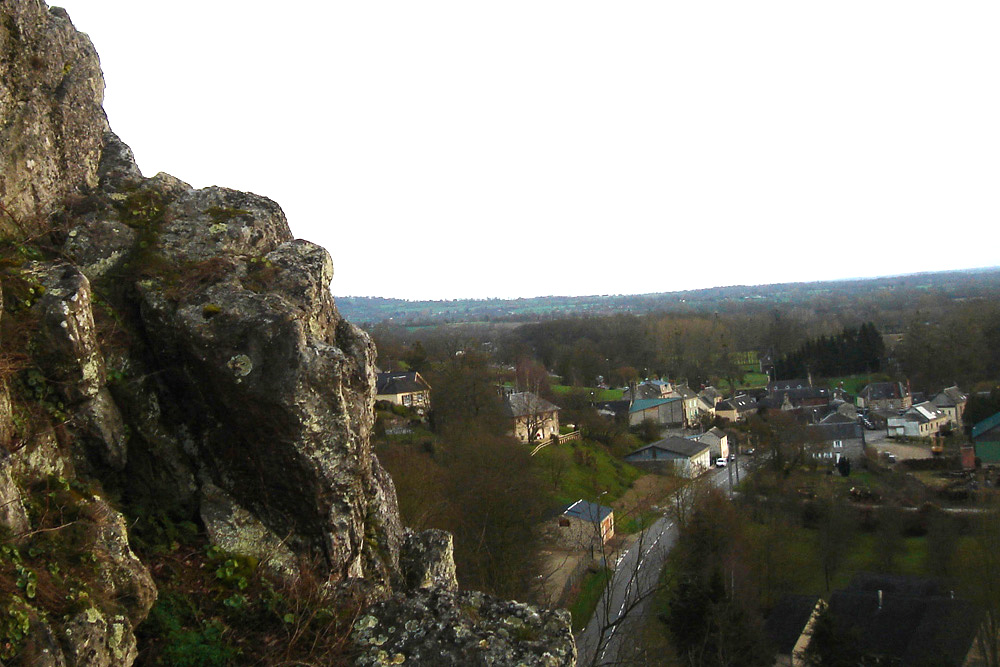 Depuis le parc du château, le sommet de la barre de Grès armoricain offre un large panorama sur la zone déprimée du Passais où s’écoulent la Varenne, l’Egrenne et la Mayenne. En creusant dans les schistes briovériens relativement tendres l’érosion a dégagé le Grès armoricain, constitué de roches très dures.
