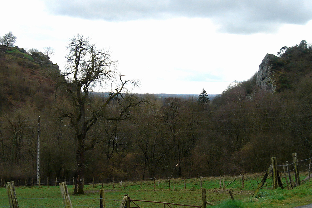 La cluse de la Varenne, qui entaille la barre de Grès armoricain, offre une trouée qui s’ouvre vers le sud sur les terrains briovériens du Passais. |