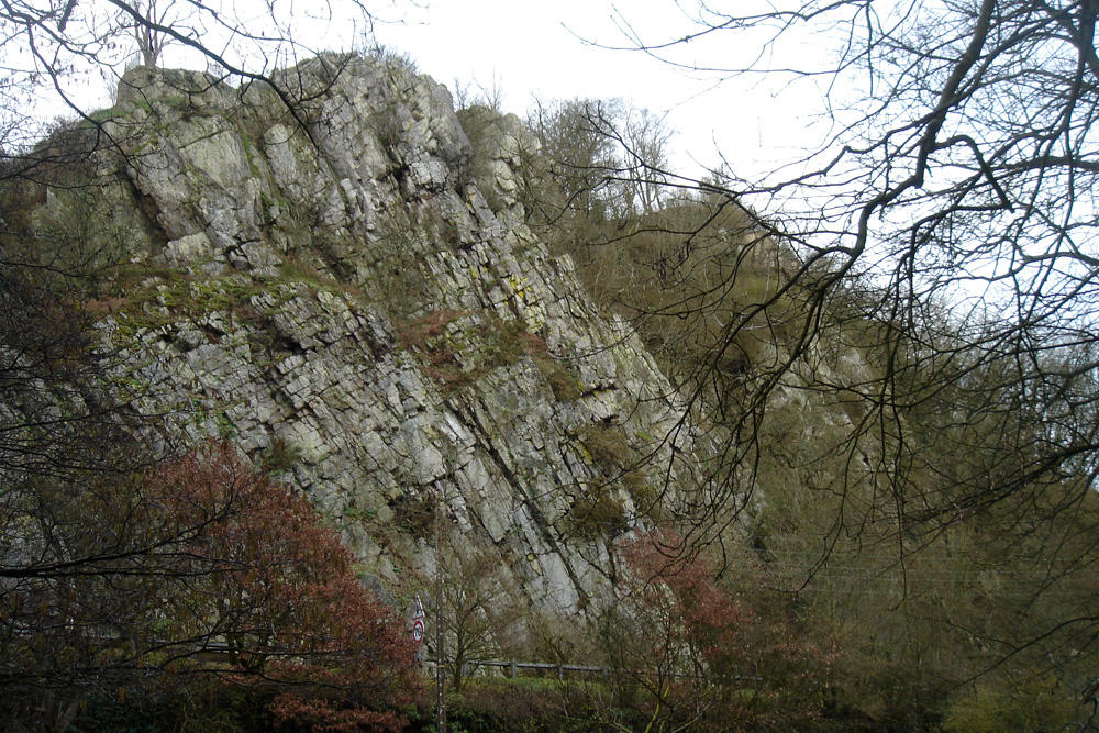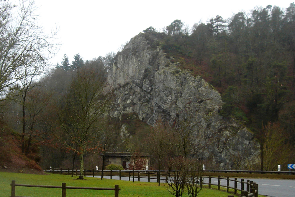 Le parking de la D22a offre une vue sur la barre de Grès armoricain de la rive droite de la Varenne, au niveau de la cluse. |