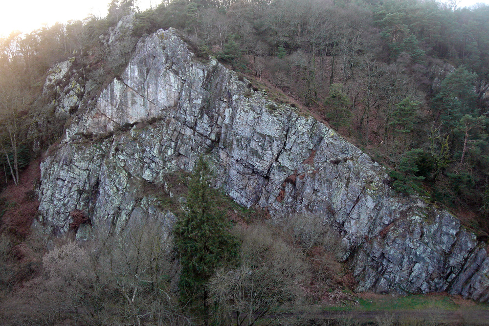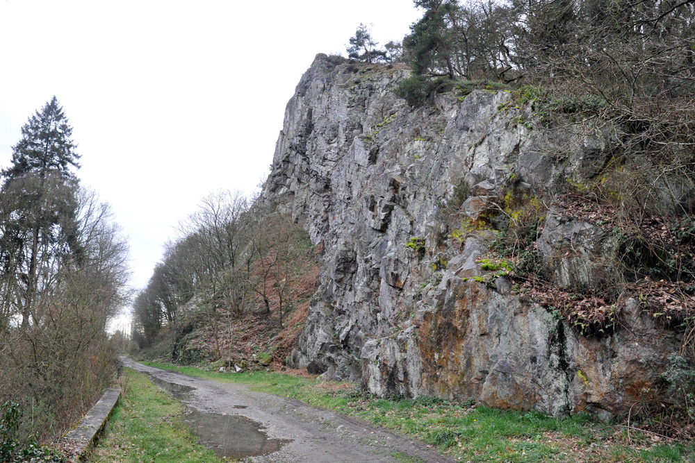 En grande partie masquée par les arbres, la partie supérieure de la formation du Grès armoricain constitue une deuxième barre rocheuse qui surmonte la précédente. Cette barre a été exploitée pour la production de matériaux d’empierrement. Le carreau de la carrière longe l’ancienne voie ferrée ; il est envahi par la végétation.
