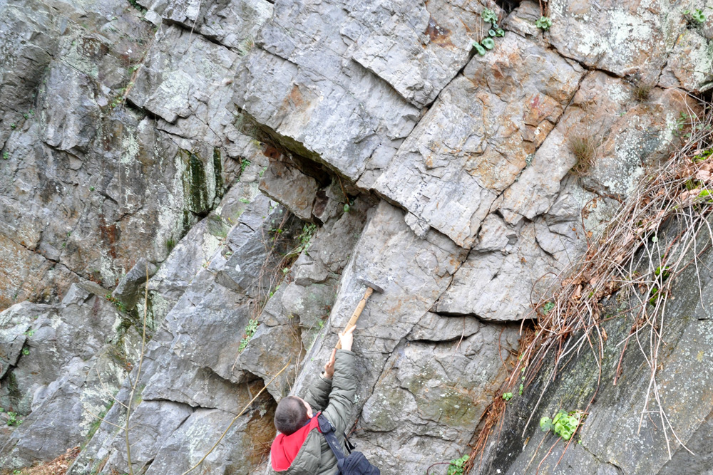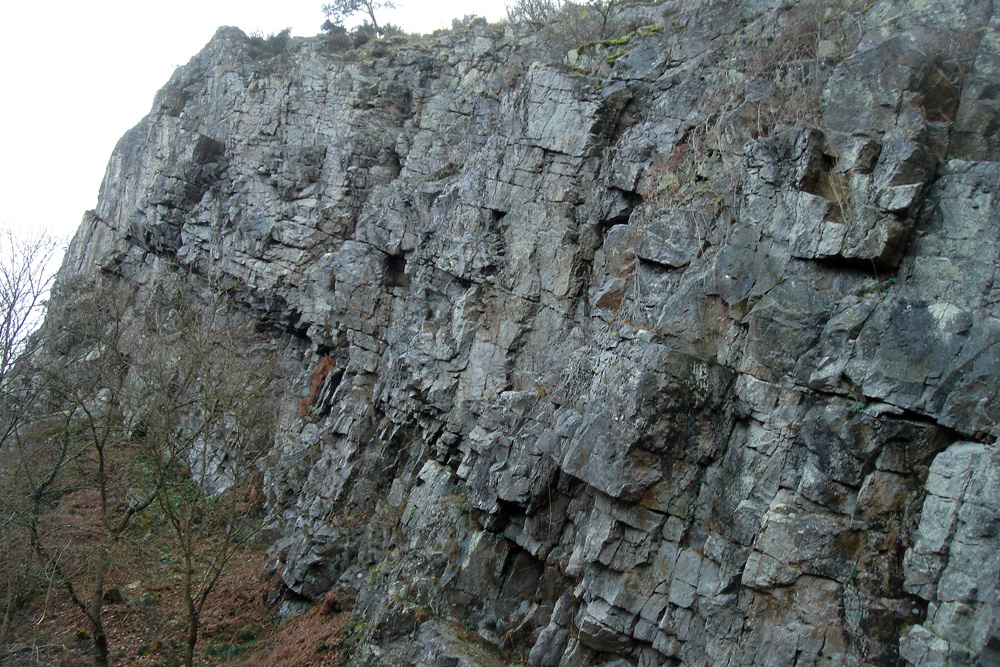 Les bancs de quartzites présentent une fracturation importante perpendiculaire à la stratification (qui plonge vers la droite). |