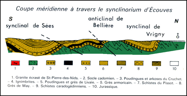 Le site de Goult (commune de la Lande-de-Goult) doit son intérêt géologique et son aspect pittoresque à la présence d’une barre de Grès armoricain appartenant au flanc nord du synclinal de Sées. Cette barre est traversée par la cluse de la Cance ; elle constitue en rive gauche un éperon rocheux qui supporte la chapelle Saint-Michel, lieu de pèlerinage, ainsi qu’un ancien camp romain. Barre de Grès armoricain à Goult |