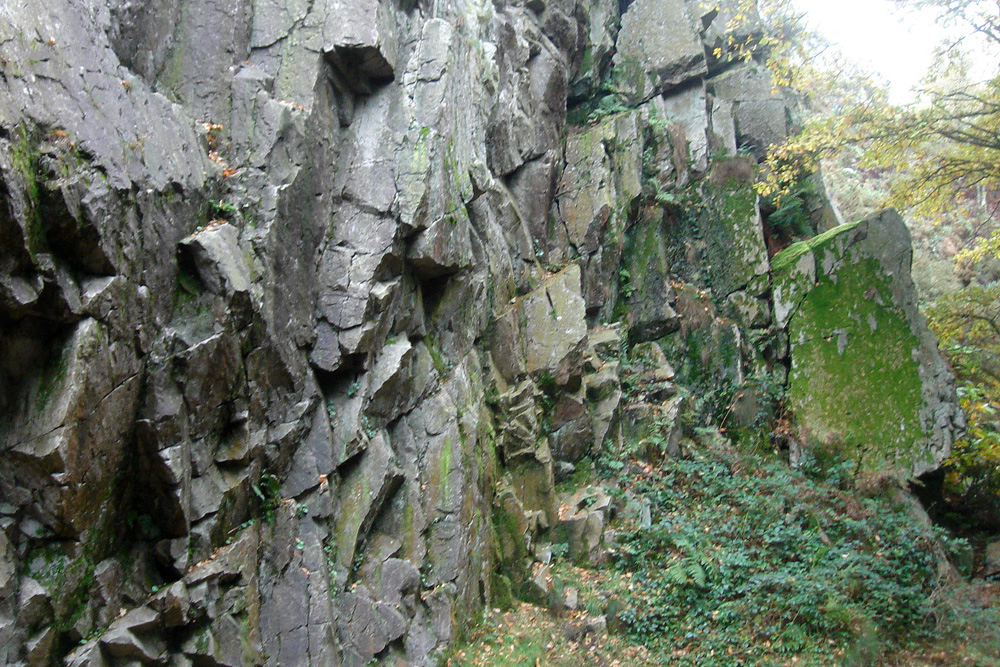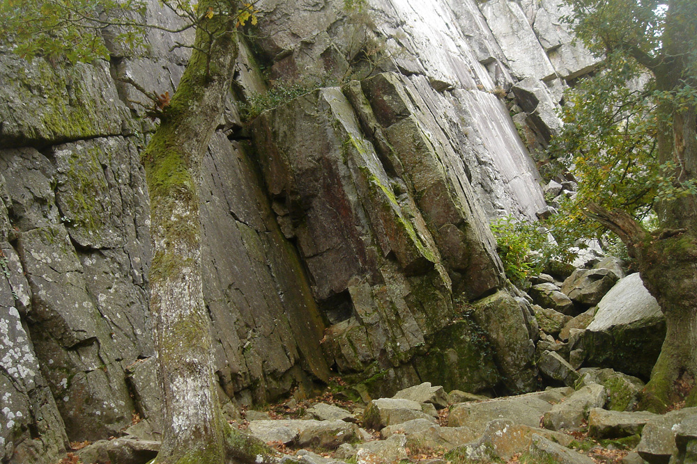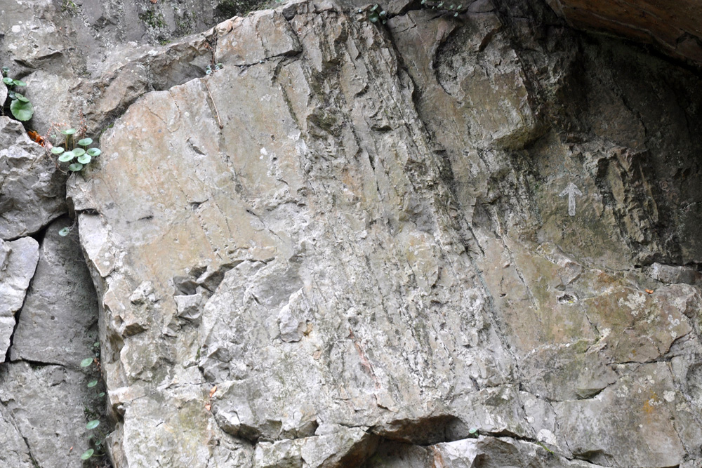 Comme dans la barre inférieure, les bancs plongent de 25° vers le nord et sont découpés par des plans de fracturation subverticaux. |