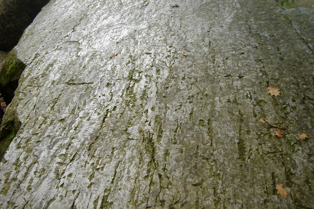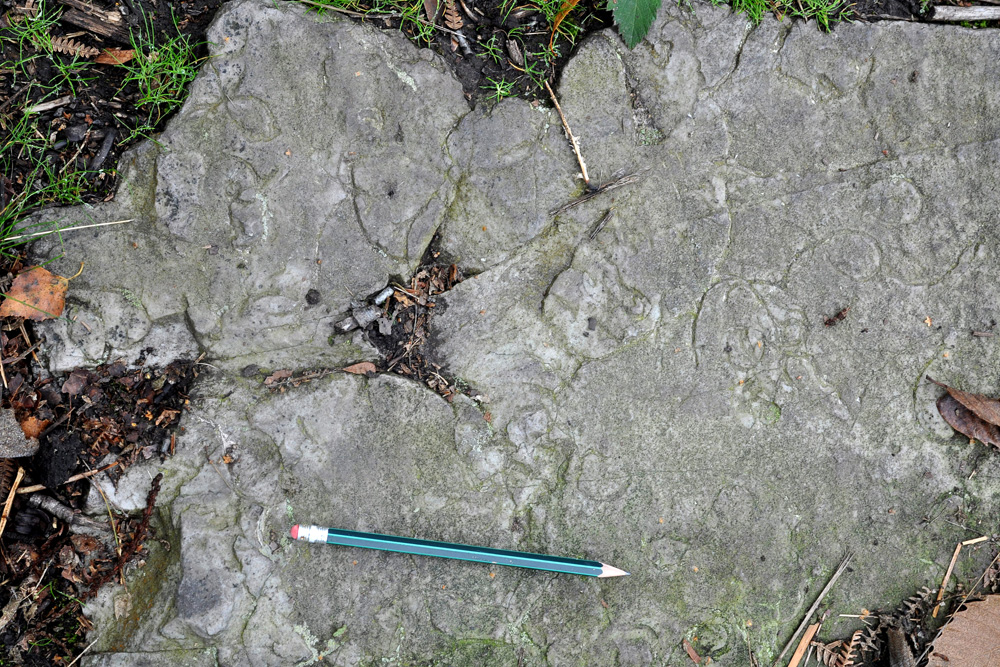 Traces de bioturbation (ichnogenre non identifié) en surface de banc au niveau de la vire.