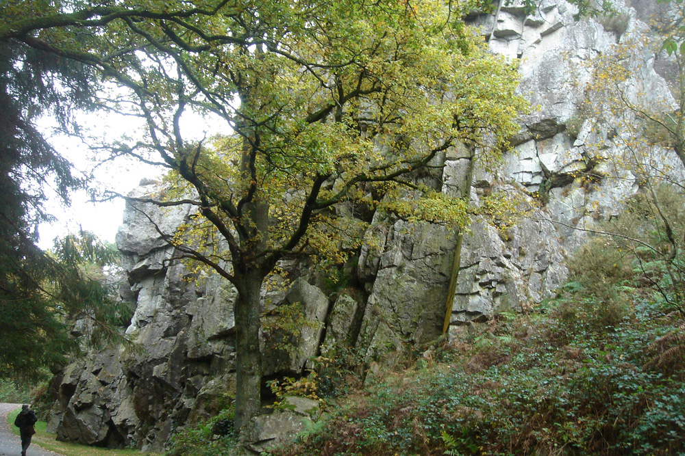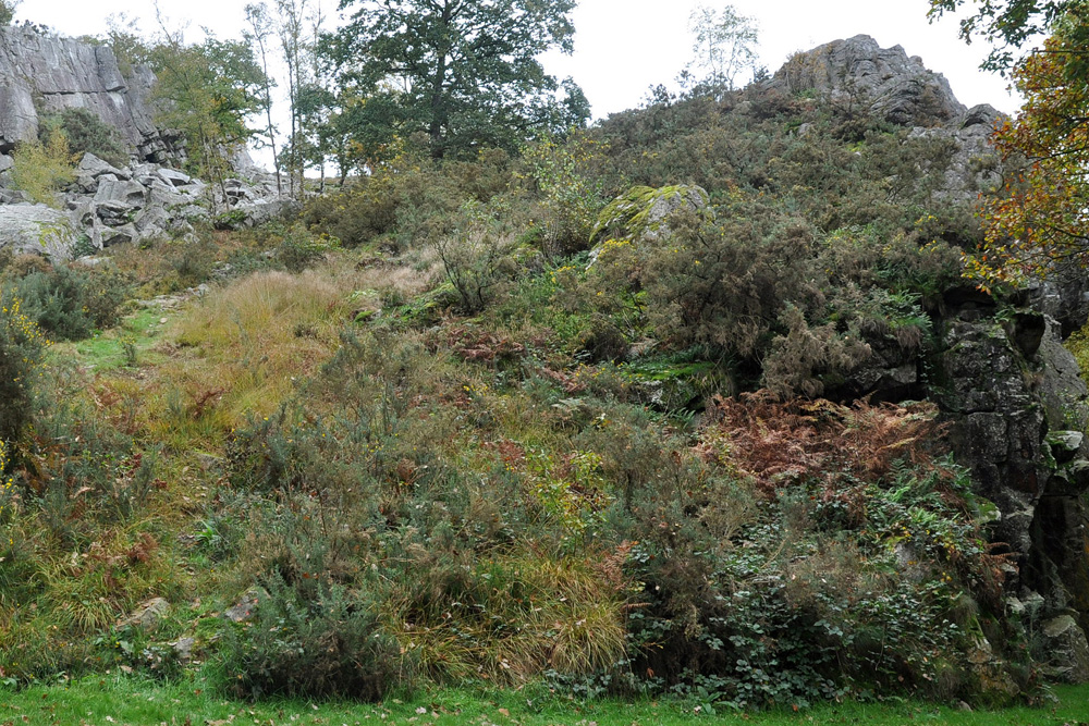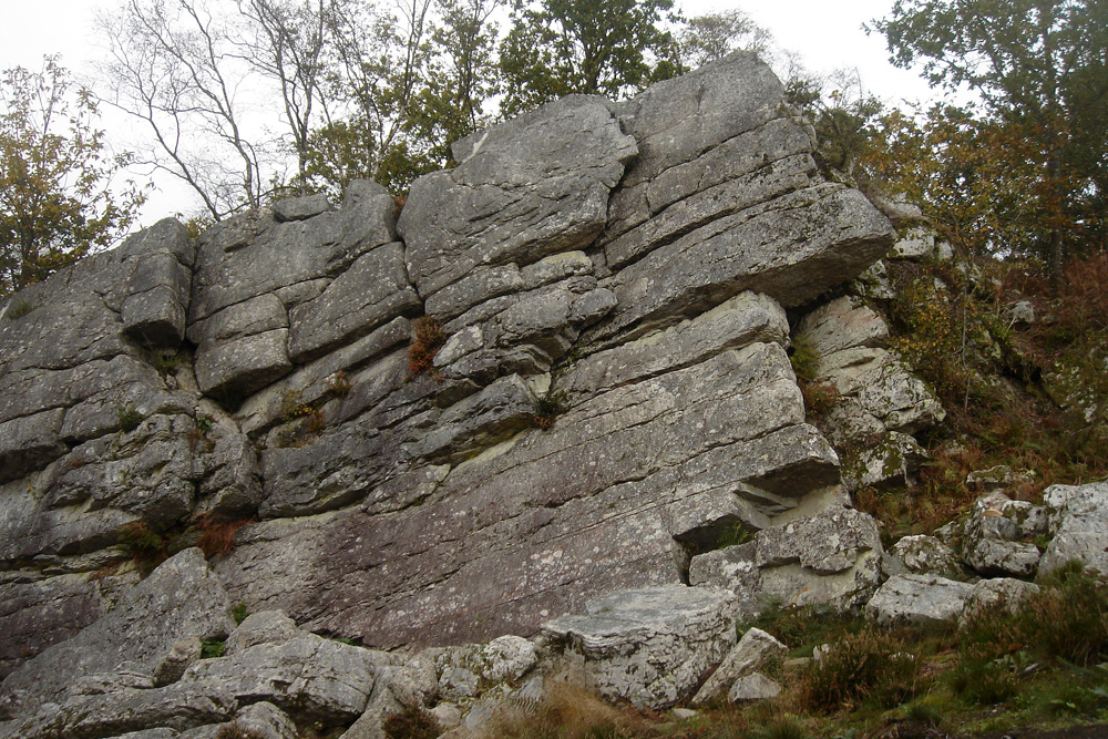 Le Grès armoricain de Fosse Arthour se présente sous la forme de deux barres de grès en bancs massifs séparées par une vire correspondant à des niveaux plus minces et moins résistants. La barre inférieure, à droite sur la photo, marque l’aval de la gorge.