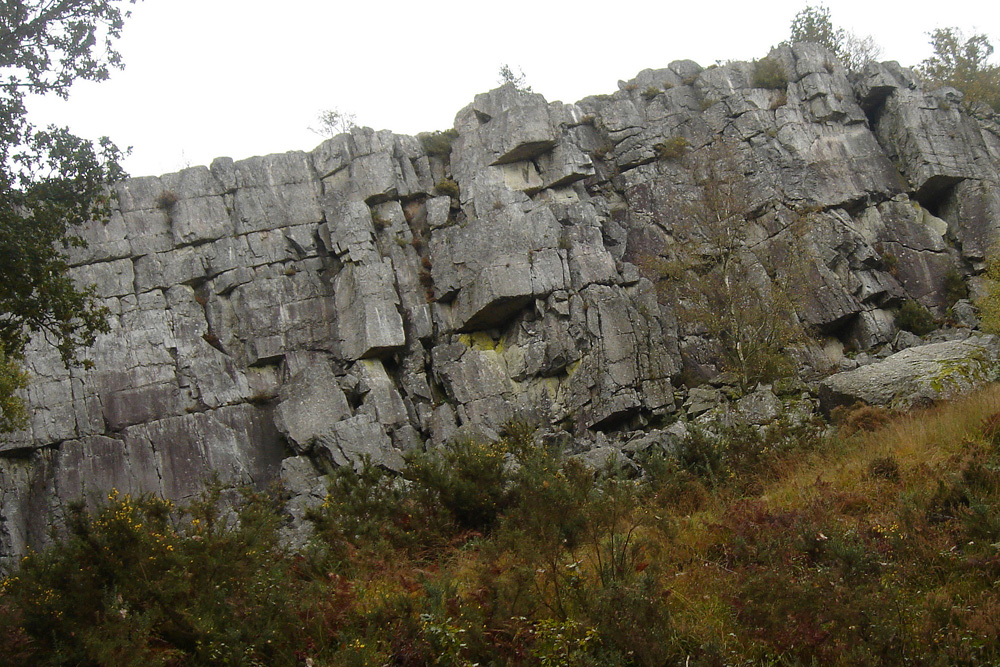 Les bancs épais et massifs de la barre inférieure renferment de nombreux Skolithos, anciens terriers verticaux pouvant atteindre 1 m de longueur |