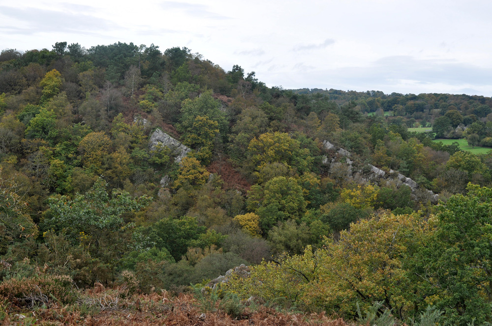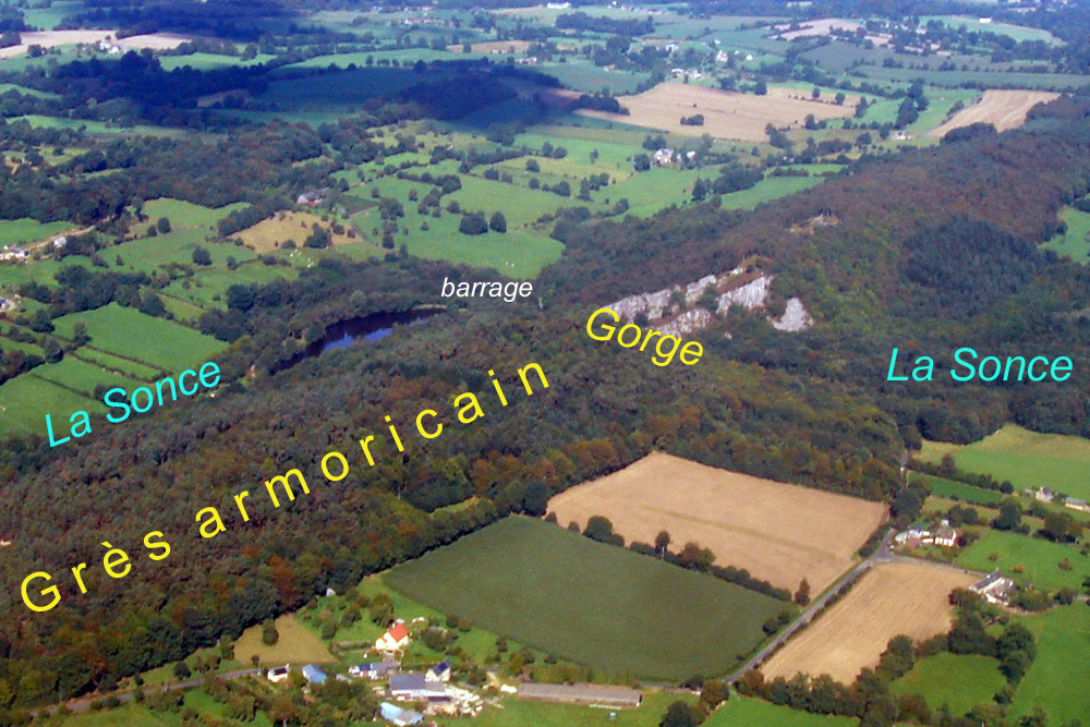 Venue du NW, la Sonce longe d’abord le bord nord de la barre de Grès armoricain boisée, orientée WNW-ESE ; elle s’élargit au niveau d’un petit barrage, puis elle s’incurve brutalement vers le sud et traverse la barre en y en entaillant une gorge étroite.