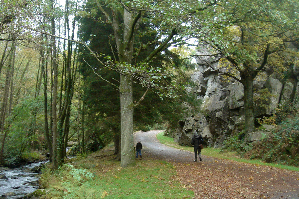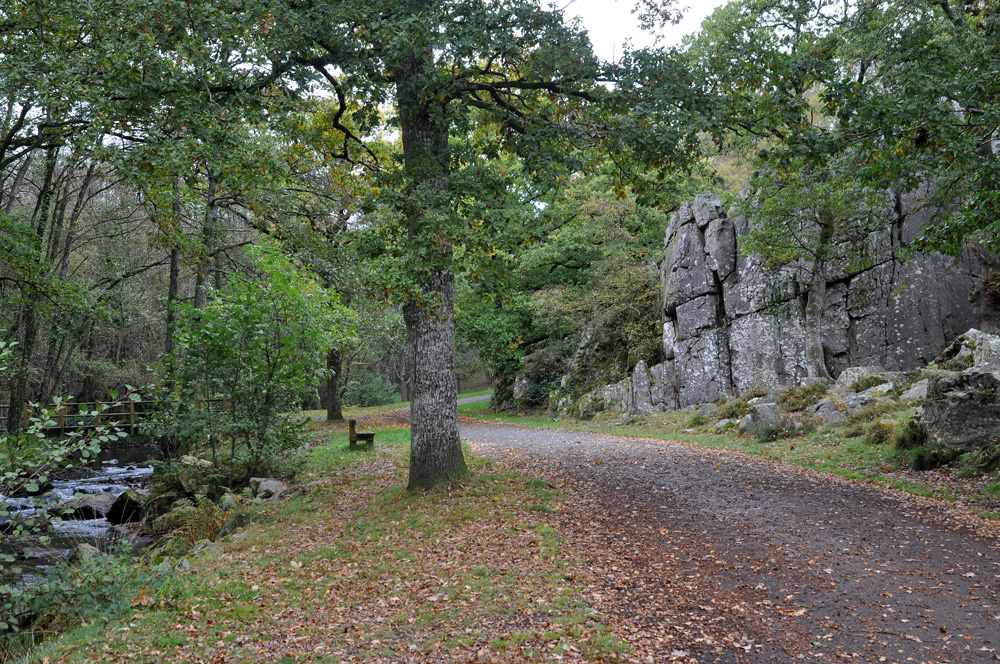 En rive gauche, la paroi rocheuse verticale, taillée dans le Grès armoricain massif, confère à la gorge une morphologie de cluse. |