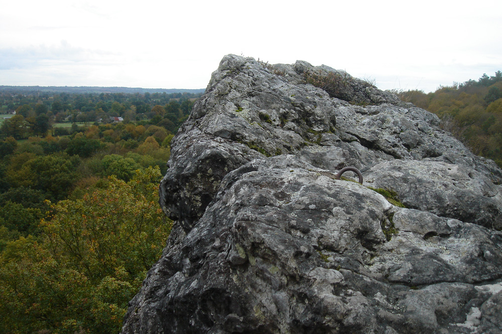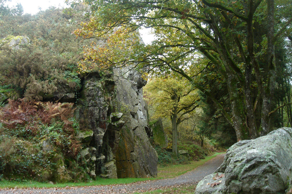 A l’aval, la gorge débouche sur le bocage du Domfrontais. L’anneau ancré dans le rocher rappelle que la barre de Grès armoricain de Fosse Arthour est un site d’escalade très fréquenté. |