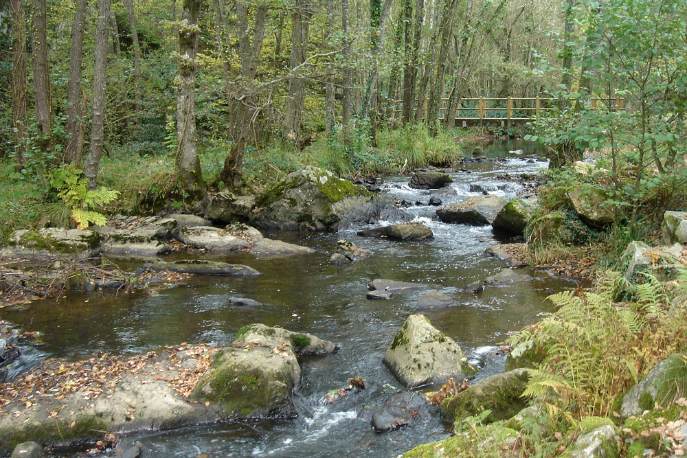 A l’amont, le pont de bois permet d’accéder au petit barrage qui retient les eaux de la Sonce sur la bordure nord de la barre de Grès armoricain. |