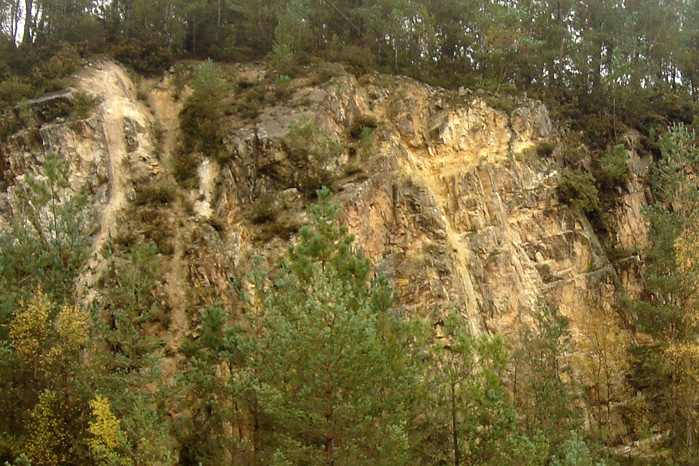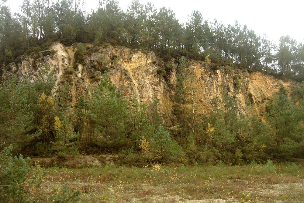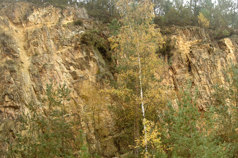 Partie Nord-Est de la carrière D’une hauteur de 15 mètres, le front de taille entame la barre supérieure (à gauche), puis des niveaux très altérés jaunâtres à rougeâtres, puis la barre inférieure du Grès armoricain (à droite). Cette succession correspond à celle observée dans la Fosse Arthour |