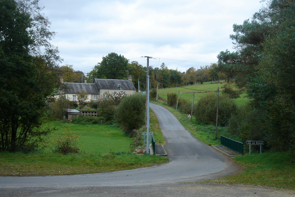 Le pont sur la Sonce vu depuis l’entrée de la carrière Ici, la Sonce coule dans la formation des Schistes du Pissot, qui succède à la formation du Grès armoricain dans la série stratigraphique. La Sonce suit un cours Ouest-Est, dans les schistes tendres, le long de la barre rocheuse de Grès armoricain avant de traverser cette barre 600 m plus loin à la Fosse Arthour. |