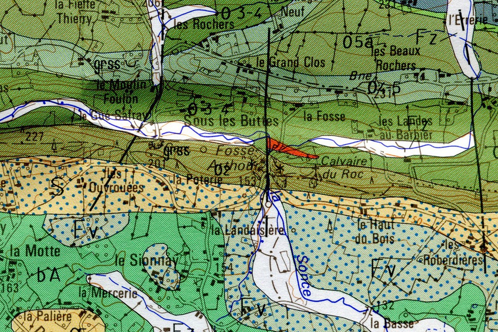 La Sonce a creusé une gorge, appelée la Fosse Arthour, à travers la barre de Grès armoricain (Ordovicien) de la bordure sud du synclinal varisque de Mortain-Domfront. Les terrains ordoviciens du synclinal, orienté WNW-ESE, reposent sur les schistes briovériens du socle cadomien qui s’étend vers le Sud. Barre de Grès armoricain de Fosse Arthour |