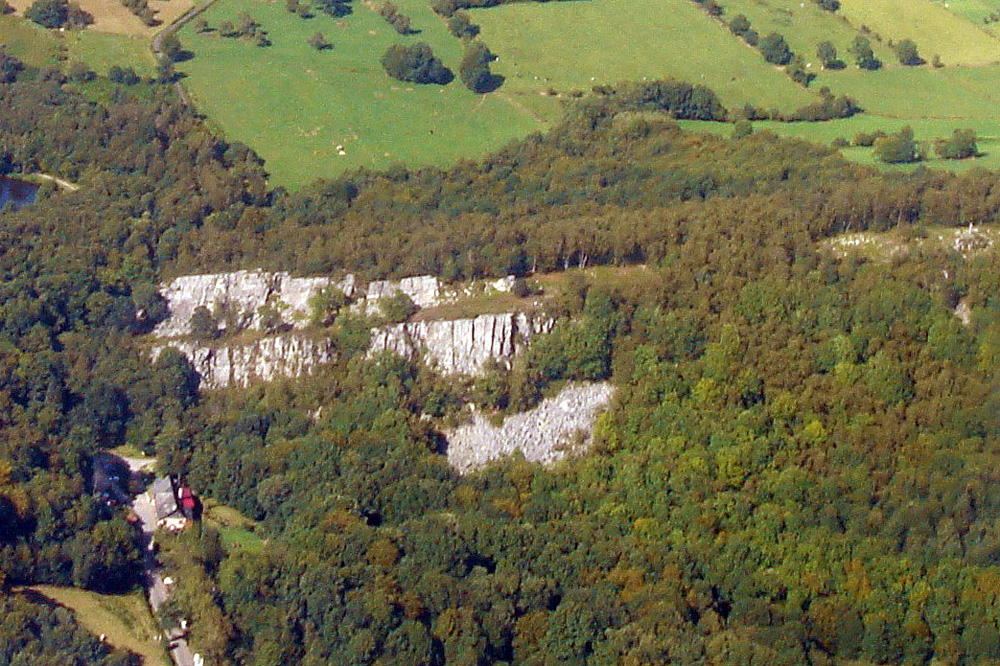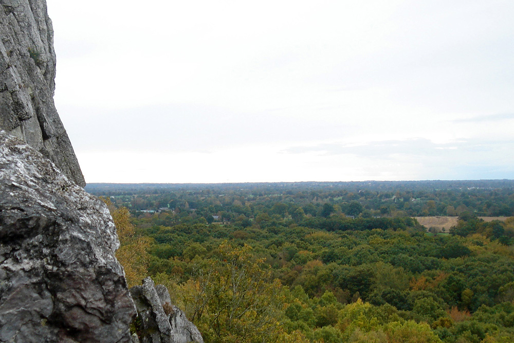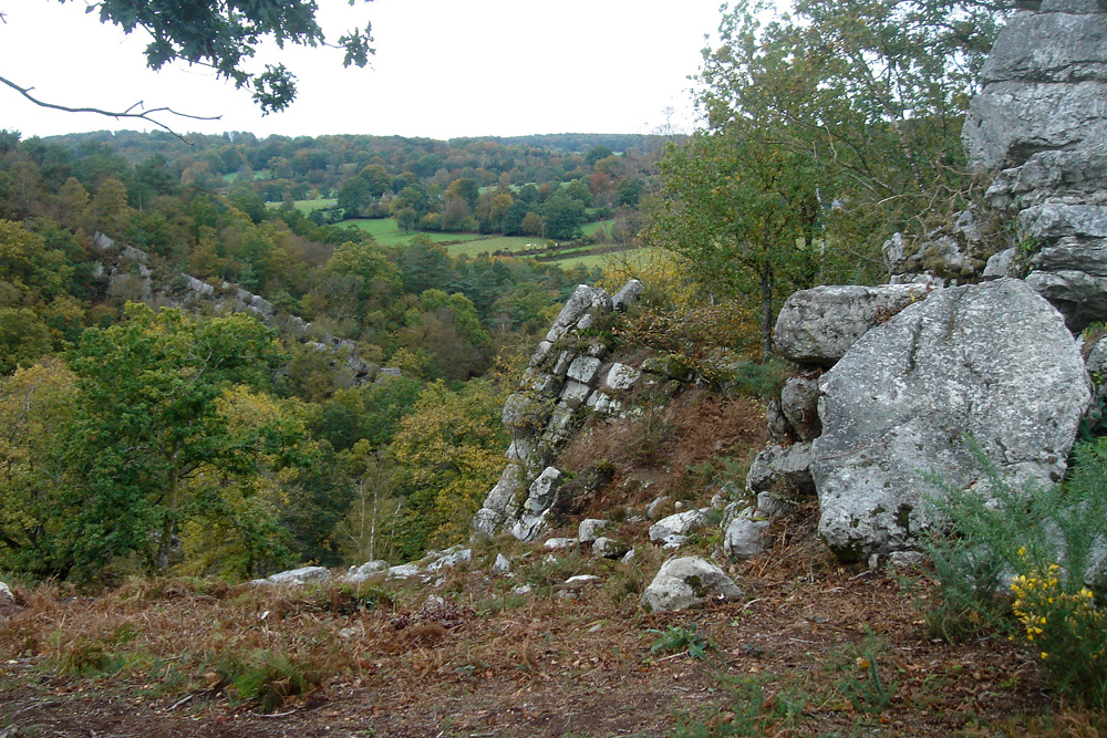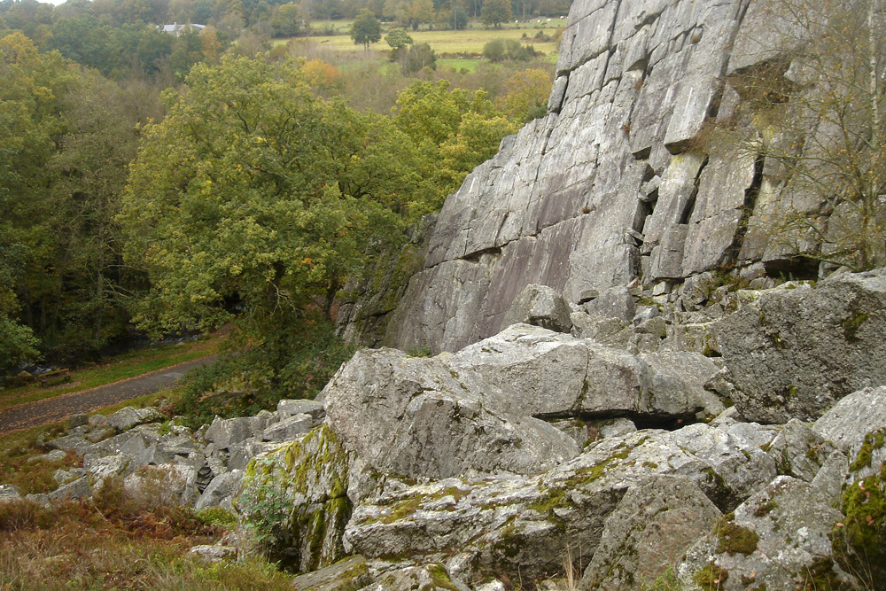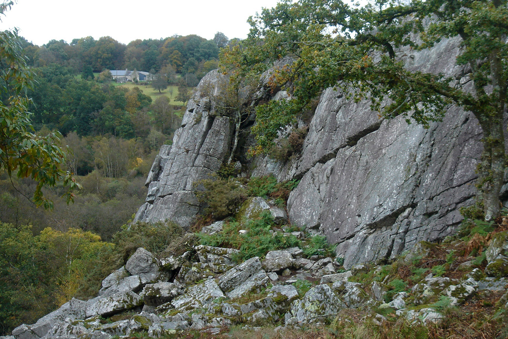 Dans la haute muraille formée par la barre de Grès armoricain, les quartzites, roches dures, stratifiées et fracturées, offrent de bonnes prises ainsi que des surplombs pour les amateurs d’escalade. |