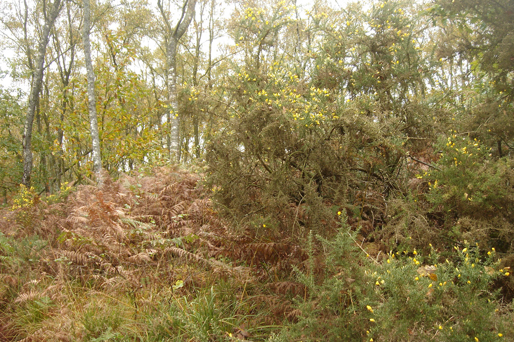 Ajoncs, fougères, et bouleaux constituent une végétation adaptée au substrat siliceux que constitue le Grès armoricain. |