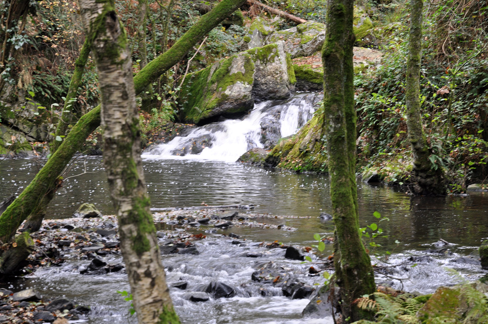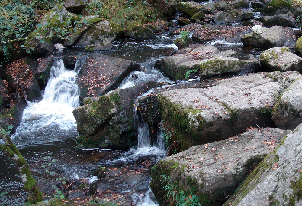 Lors de la traversée de la barre inférieure du Grès armoricain, la Sonce se jette en cascade dans la « Fosse Arthour » où plane la légende du roi Arthur et de la reine Guenièvre. |
