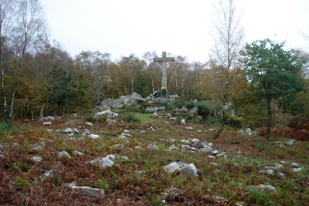 Des blocs épars de quartzite gris clair parsèment le sommet de la barre supérieure de Grès armoricain couverte par une lande à fougères. La croix du calvaire est taillée dans de la granodiorite provenant du socle cadomien. |