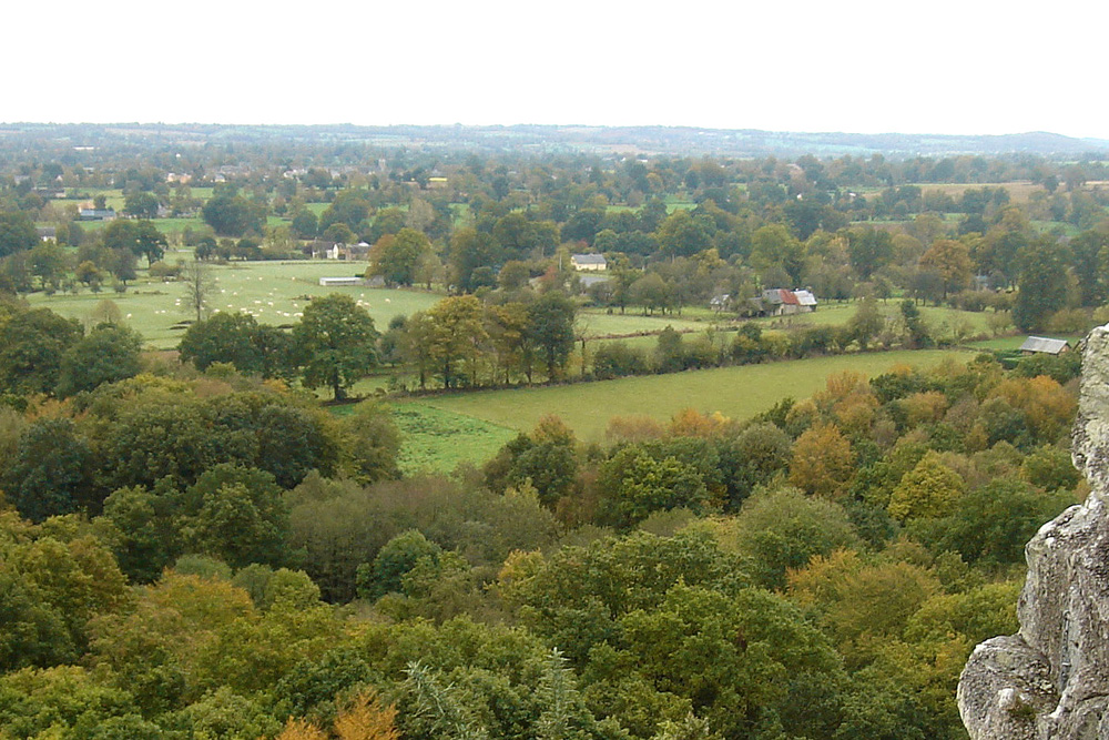 Le Mont Margantin (vue vers le SE) Ce relief, visible depuis le sommet de la barre de Grès armoricain, est situé à 12 km au SE de la Fosse Arthour. Constitué de cornéennes, il appartient à l’auréole de métamorphisme du massif granitique de Passais-le Horps. |