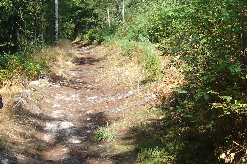 Du sable blanc recouvre le chemin du bois de la Motte au sommet du versant de la rive gauche. Ce sable, constitué presque exclusivement de grains de quartz, provient de l’altération des bancs de Grès armoricain qui se désagrègent sous l’action de l’eau d’infiltration.